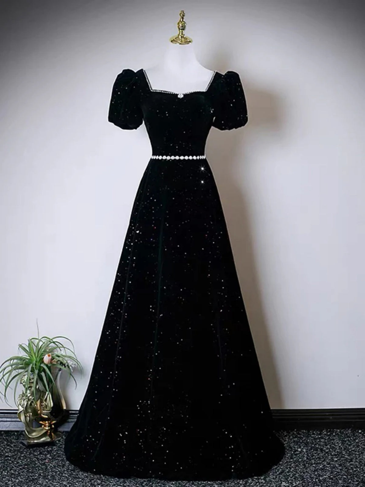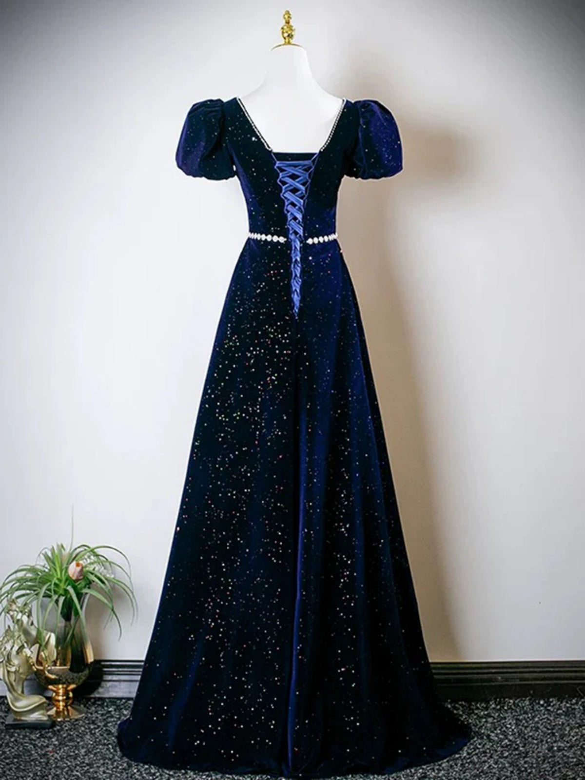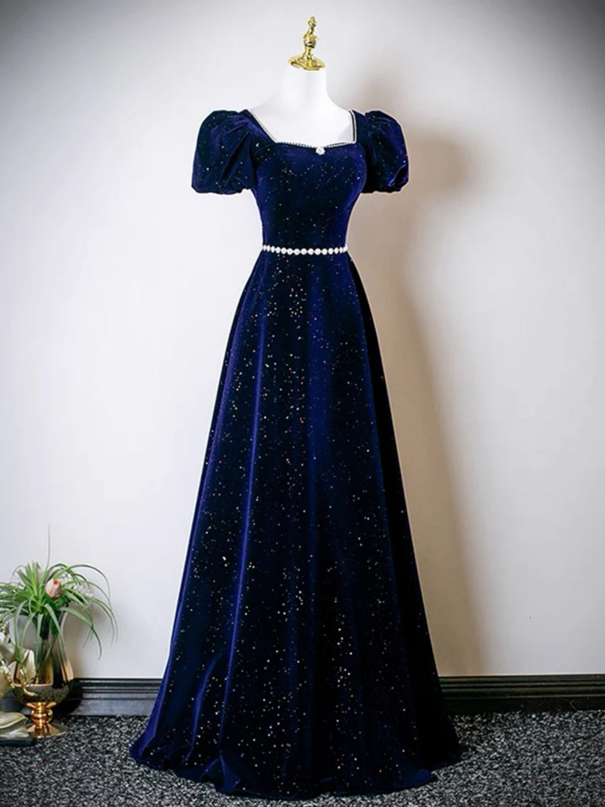 Square Neck Dark Navy Blue Black Velvet Long Prom Dresses, Dark Blue Black Long Formal Evening Dresses