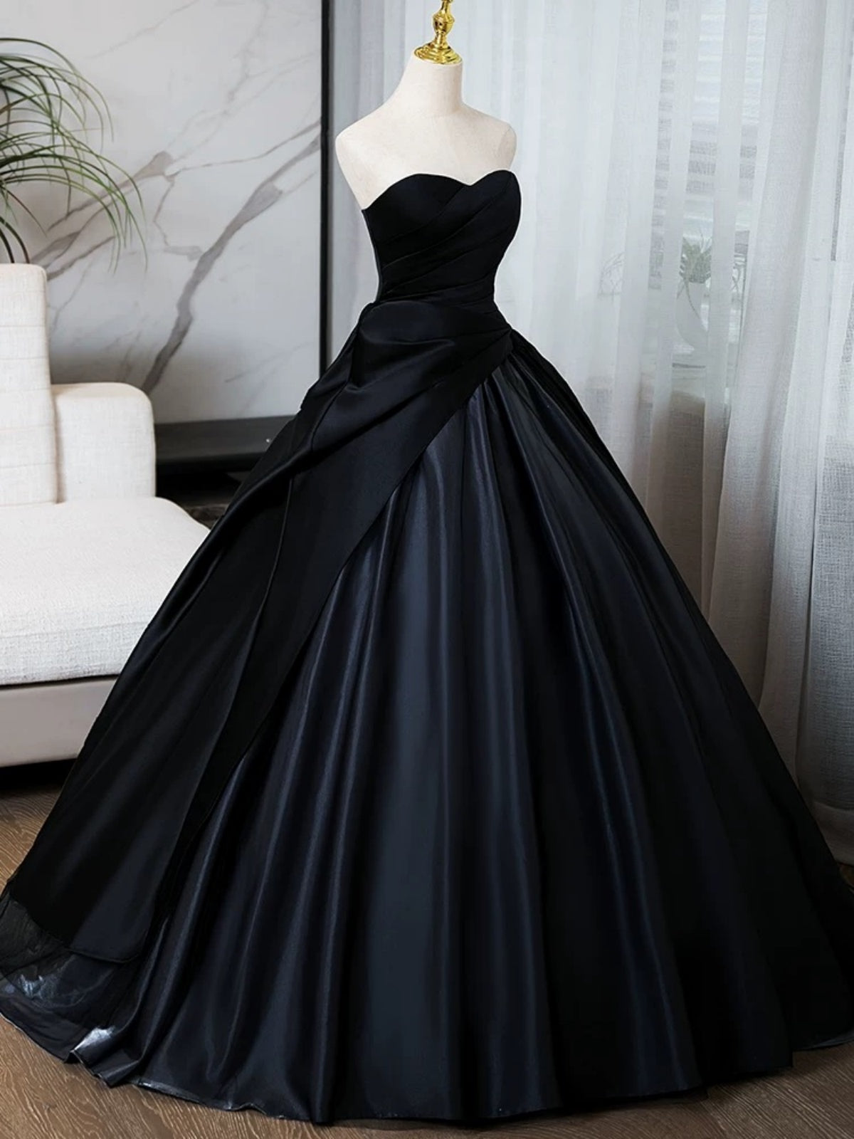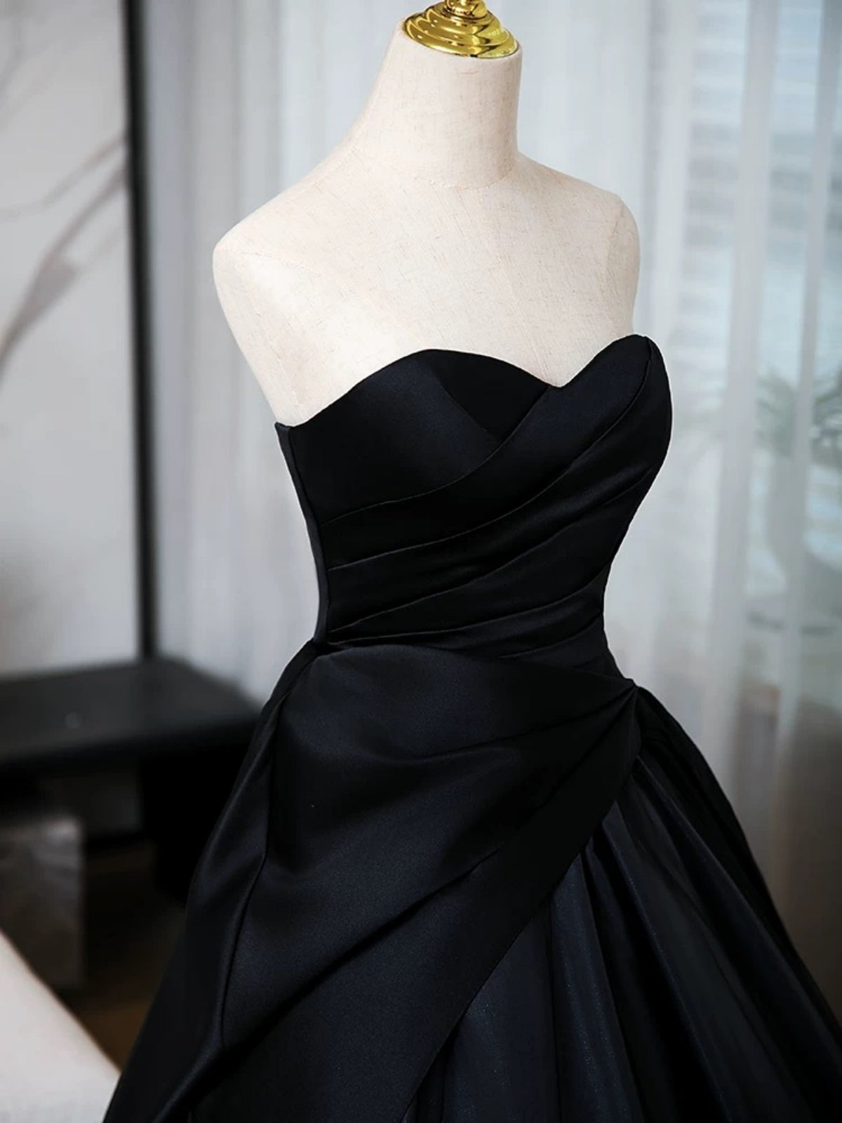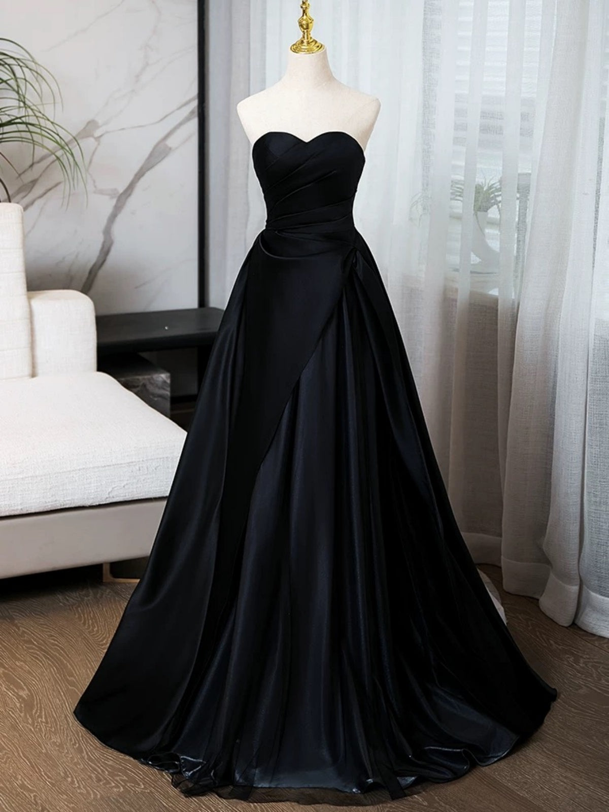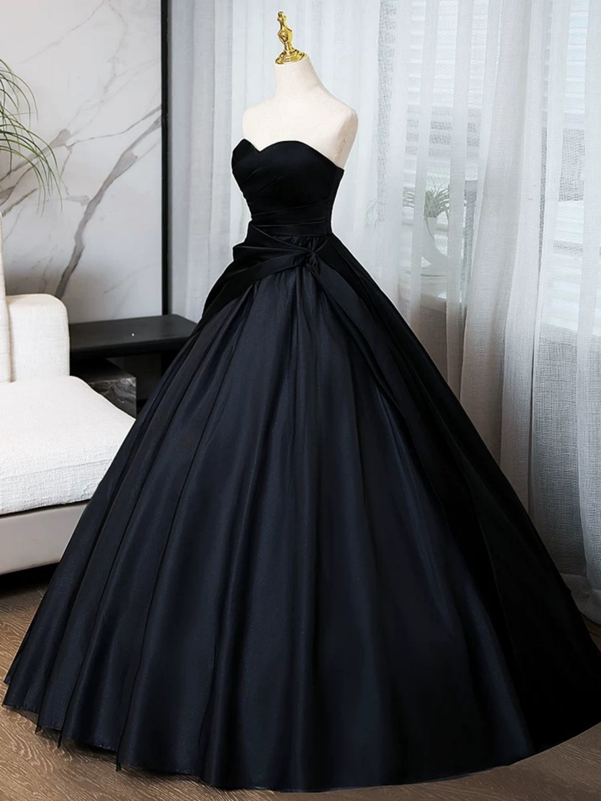 Sweetheart Neck Black Puffy Satin Prom Dresses, Black Satin Long Formal Evening Dresses