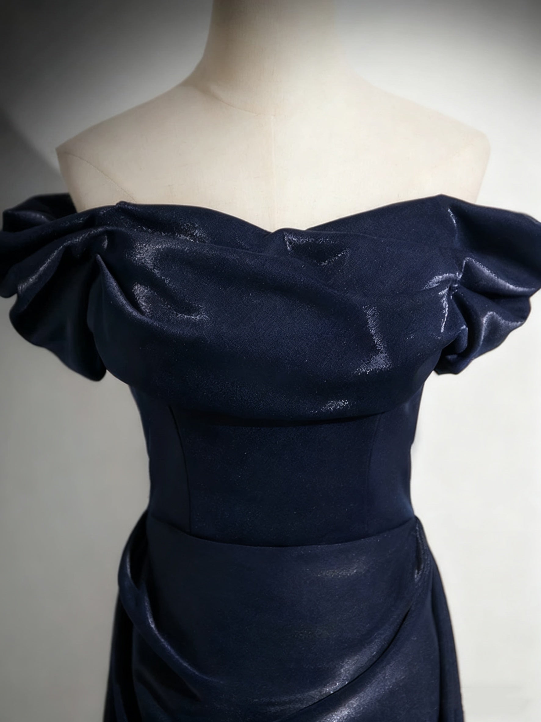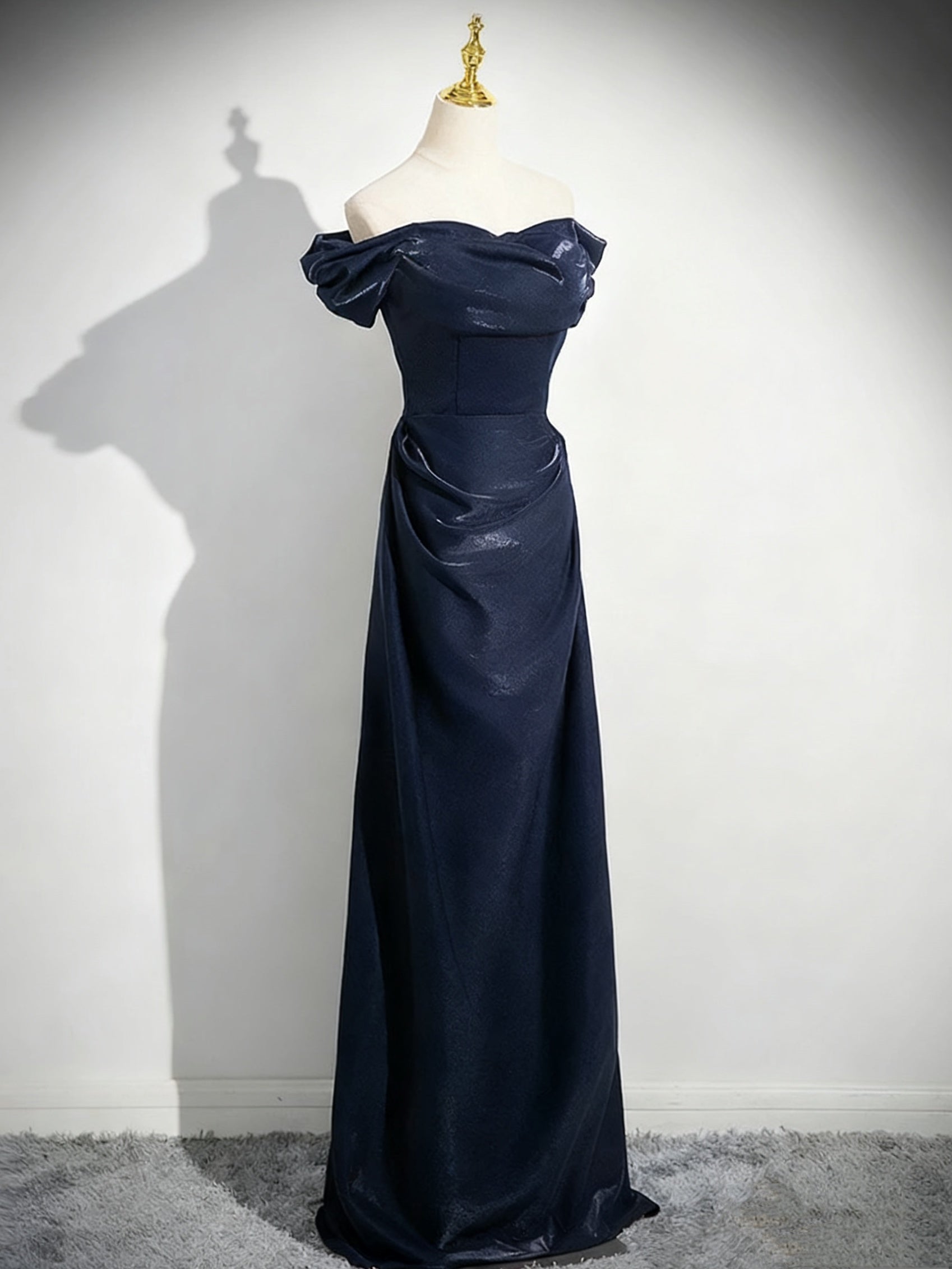 Off the Shoulder Dark Blue Satin Long Prom Dresses, Navy Blue Satin Long Formal Dresses
