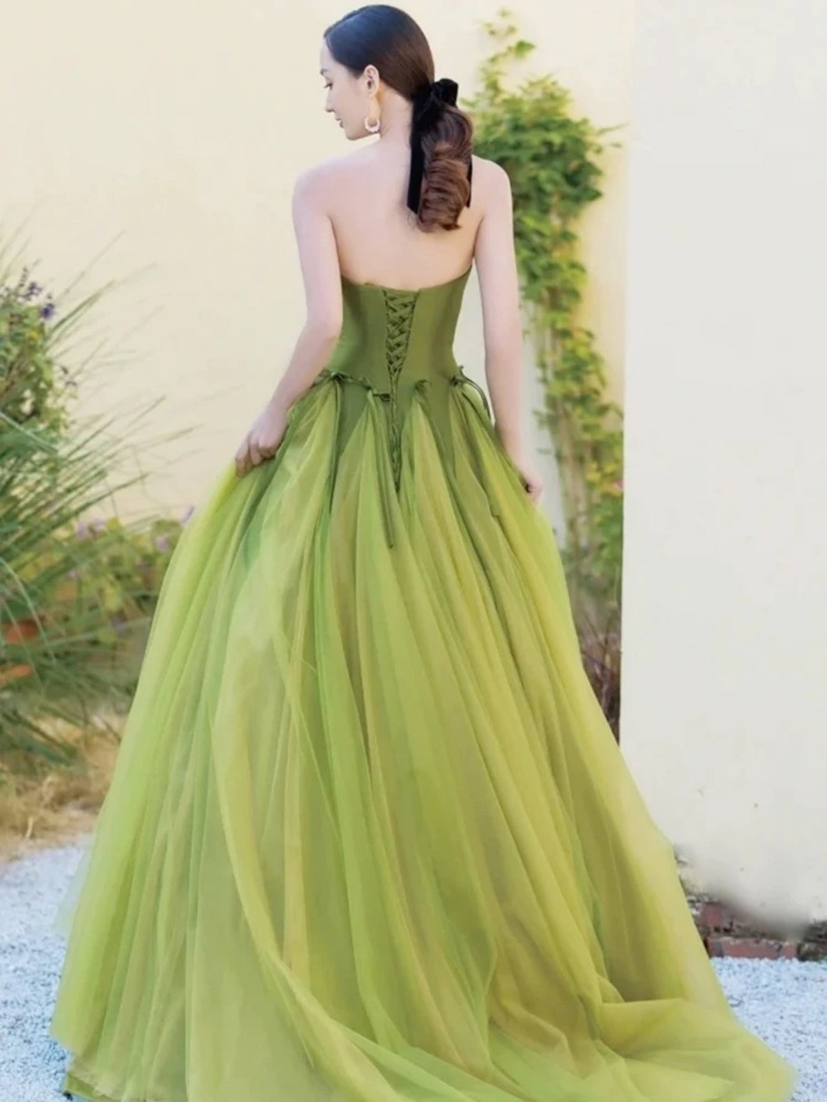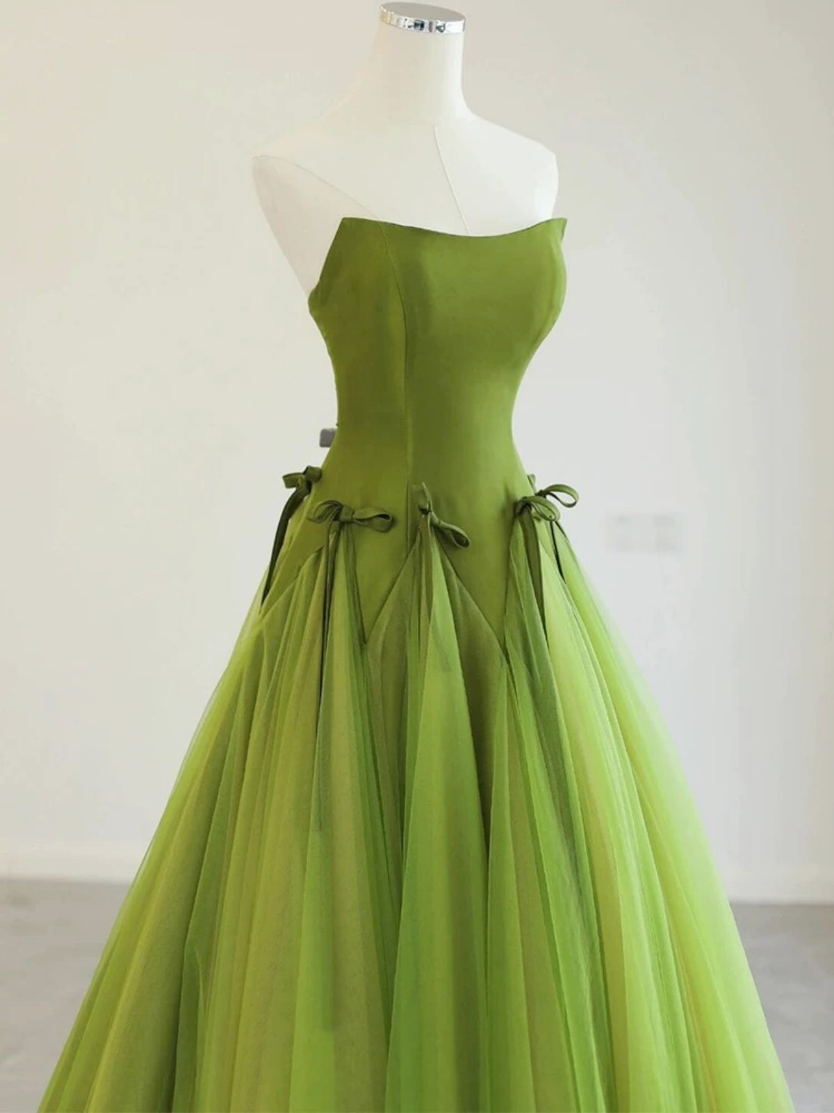Strapless Green Tulle Satin Long Prom Dresses, Green Satin Tulle Long Formal Evening Dresses